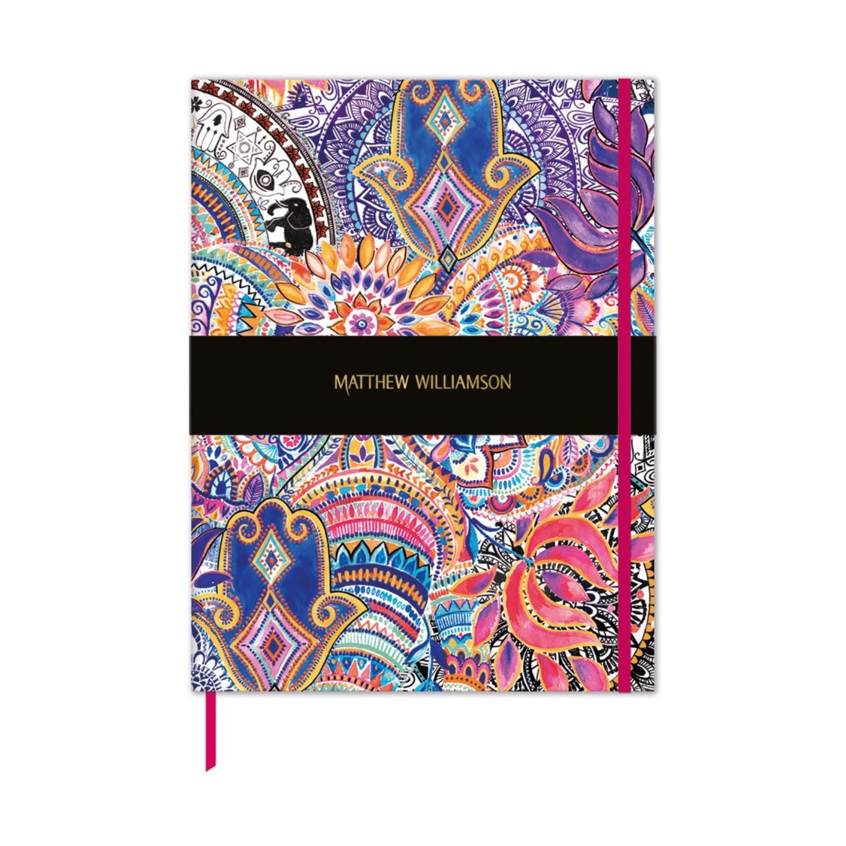 Hard cover with elastic closure, bookmark ribbon and storage pocket.