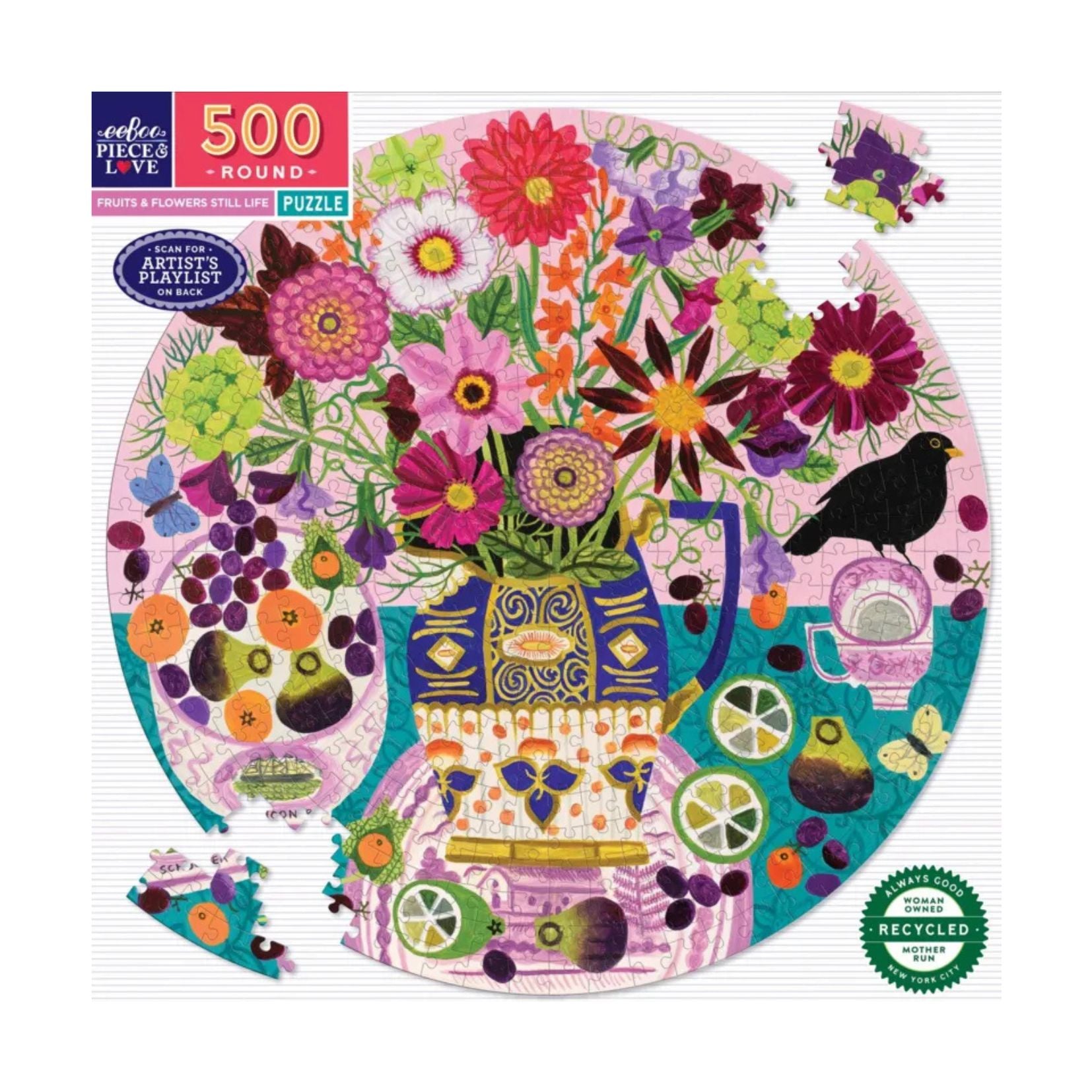 eeBoo puzzles are made from 90% recycled cardboard, and printed with vegetable-based inks for limited environmental impact. 500-piece round puzzle. Model included. A beautiful round floral still life by Vanessa Bowman. Playlist by the artist via QR code on the box, to complete your puzzle to music! Box size: 25 x 25 cm Puzzle size 58.5 cm diameter